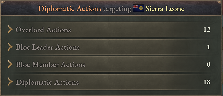 The type of a diplomatic action determines from where it can be accessed. Current diplomatic action types are as follows: