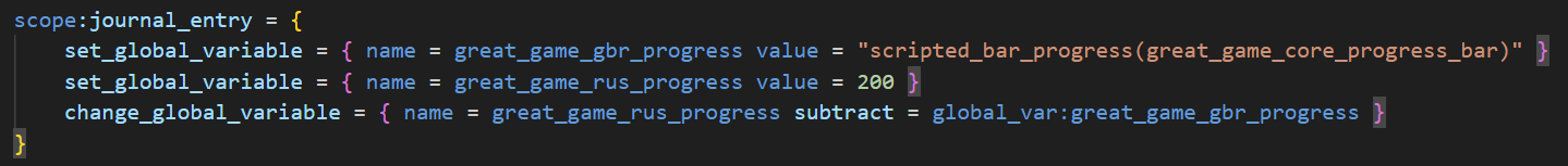 The value of a progress bar can be retrieved, compared, and used in variable math with the scripted_bar_progress trigger in a journal entry scope.