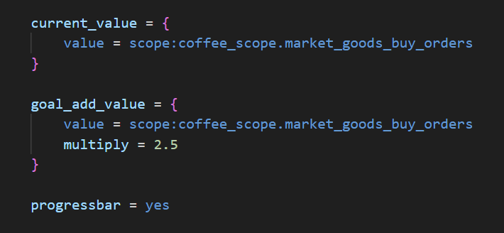 [i]Pictured: When this journal entry is initialised, it gets the current amount of coffee buy orders in one’s market, and multiplies it by 2.5. That multiplied value is the “goal”, and the current value is always equivalent to the current amount of coffee buy orders in the market.[/i]