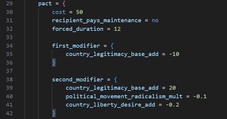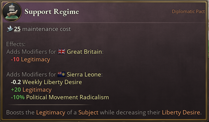 Diplomatic pacts can now apply modifiers to both involved parties. These are controlled by the first_modifier and second_modifier fields in the diplomatic pact’s script–the first_modifier applies to the initiator, and the second_modifier applies to the other country. For example, the Support Regime subject interaction gives the subject in question lowered radicalism, and less liberty desire, at the cost of some legitimacy for yourself.