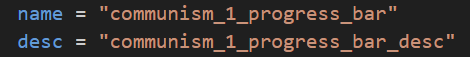 Next is the localisation for the progress bar. The desc is the text displayed on the bar itself, and the name is displayed in the tooltip when one mouses over the bar.