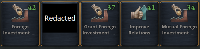 There are a few ways to acquire Foreign Investment Rights. First of all, overlords can always invest in their subjects. [b]This is part of the free 1.7 update and will allow you to do Foreign Investment where it matters the most, even if you do not own Sphere of Influence.[/b] Then there are three diplomatic pacts which you can use if you have bought the expansion: [olist] [*][b]Mutual Investment Rights[/b] which allows both countries to invest in each other [*][b]One-directional Investment Rights[/b] in either direction, so you either demand to be allowed to invest in their country or offer another country to invest in yours [/olist] [i]The [redacted] has been [redacted]. We shall see its effects on the 11. of April.[/i]