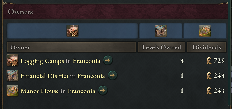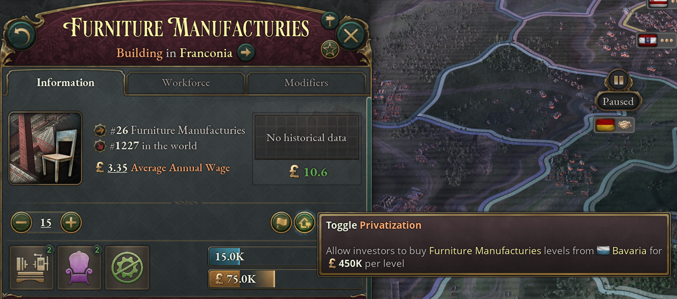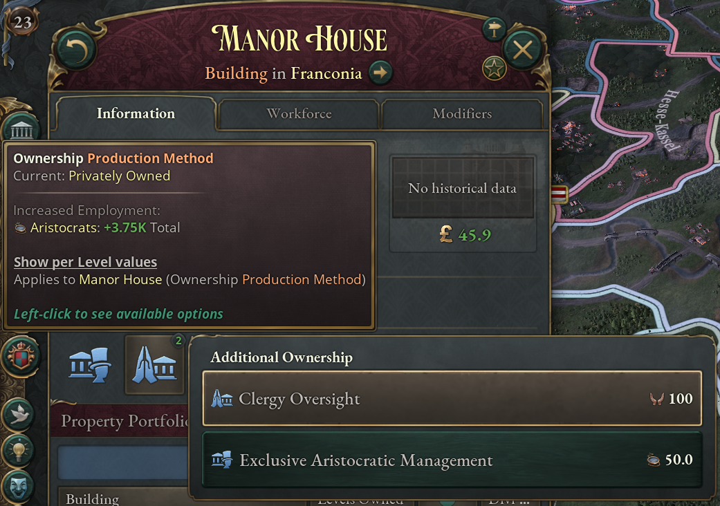 It’s 1836. In Bavaria, a proud member of the Zollverein Power Bloc, all buildings are owned by the state or the workers themselves. Capitalists, Aristocrats, and Clergymen no longer work in these buildings, and most of the Shopkeepers no longer work in production buildings directly. In addition, the Ownership Production Methods have been removed. Instead, ownership works on a per level basis, allowing a mixed ownership structure in the same building. [i]A popular Logging Camp it seems. Workers, a Financial District and a Manor House own a part.[/i]