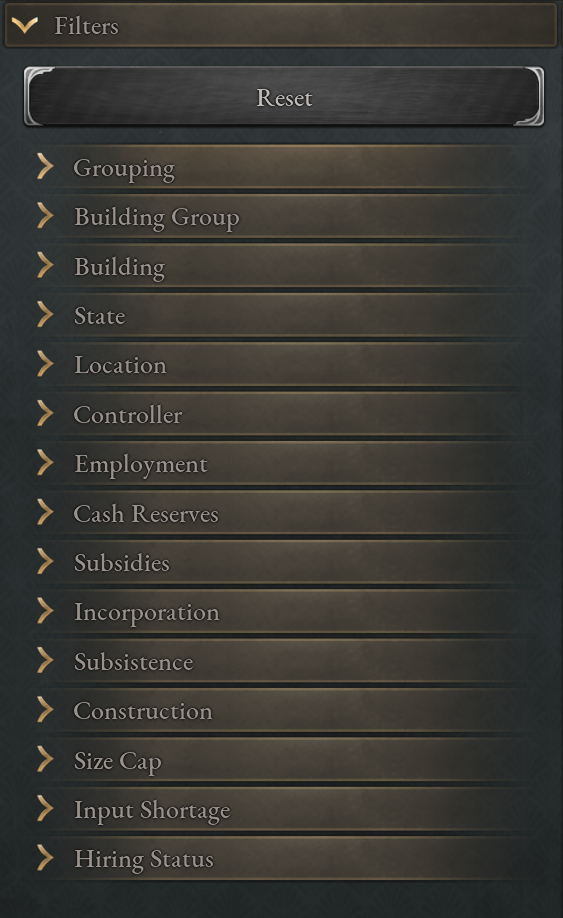This is a major new UI, that similar to the Census Data window, comes with a lot of functionality to filter the available data. Only show buildings outside your country? Sure. See all buildings that are owned by Pops and which are currently not hiring but not fully employed? No problem.