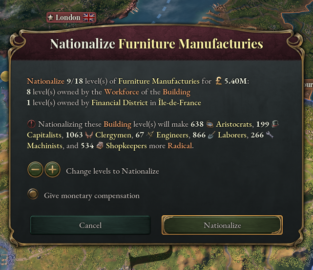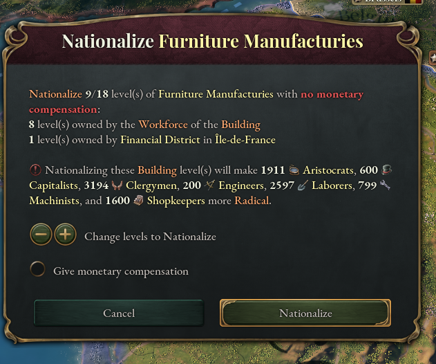 Nationalization allows you to take control of foreign assets in your country. You cannot nationalize other countries’ assets as long as they possess Foreign Investment rights in your country. Once that is no longer the case, e.g. if Bavaria left the Zollverein Power Bloc, you can peacefully nationalize their building levels in your country. For that you need to pay a sum of money from your treasury. Similarly to Privatization, the sum is determined by the construction cost + modifiers from laws. You will also be able to nationalize your own Pops’ building levels, both worker-owned and privately owned, if you’d like to take ownership. Nationalization is not seen positively by the affected Pops of course and will radicalize them. [i]“We should compensate them to reduce the quarrels.”[/i]
