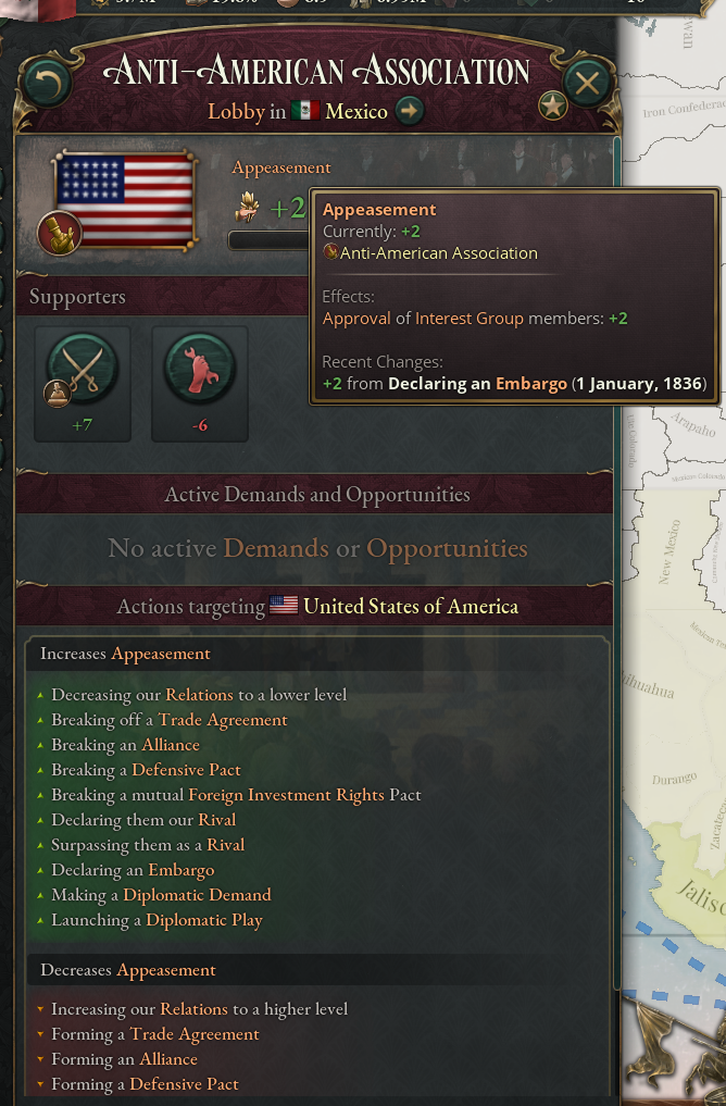 For those with the Sphere of Influence expansion, Lobbies can also make their will known through an [b]opportunity[/b] or a [b]demand[/b]. [b]Opportunities[/b] generally come in the form of some diplomatic groundwork done by the Lobby that may allow their parent country to sign a diplomatic pact that is otherwise difficult to get, or even out of reach entirely. For Pro-Country Lobbies this usually involves dealing with the target country directly, while Anti-Country Lobbies will instead work to create opportunities to cooperate with the target’s enemies and rivals. Opportunities can be declined without any penalty, and will only result in a loss of Appeasement if accepted but not followed through on. Accepting and following through on the Opportunity will of course increase their Appeasement.