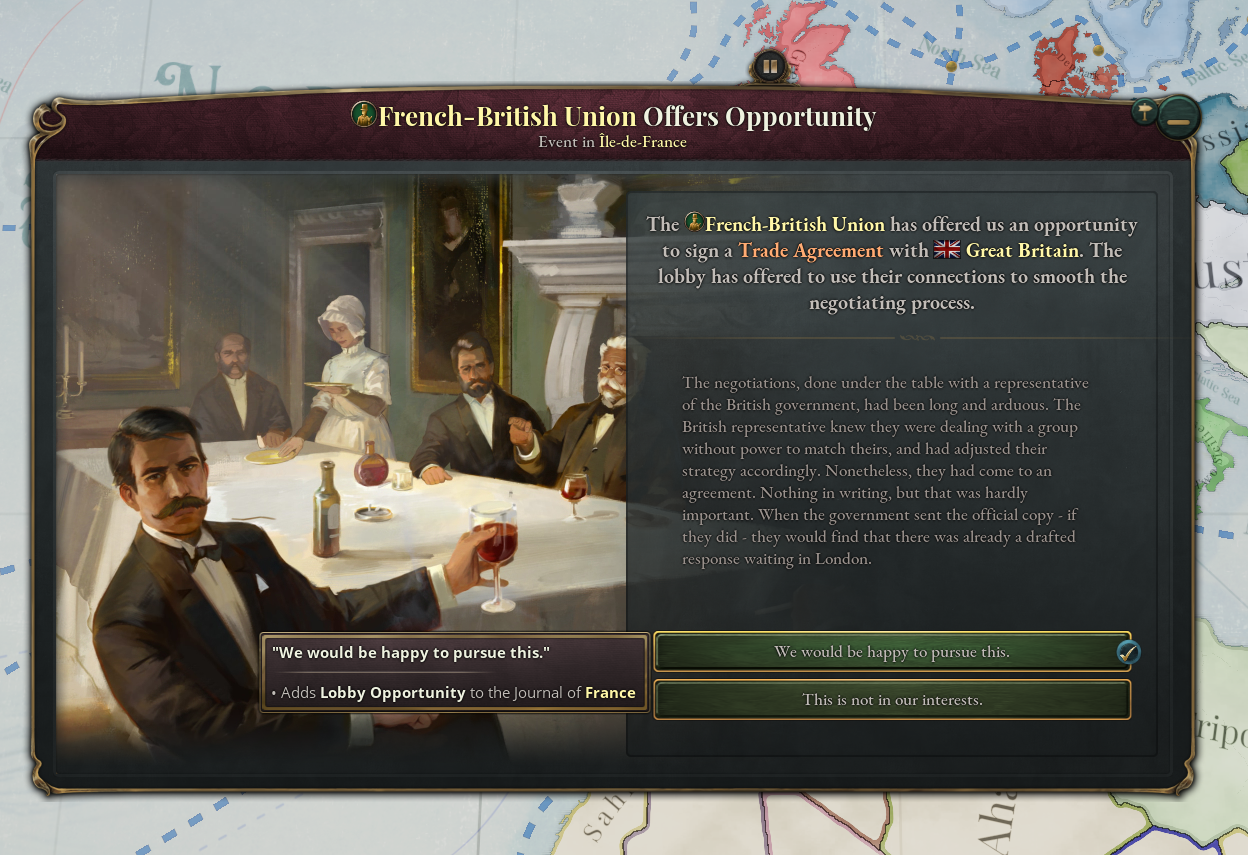 [i]Even though Great Britain is Cautious about France and thus not willing to sign a Trade Agreement under normal circumstances, the acceptance bonus granted by the opportunity created by the Pro-British Lobby should be enough to secure the deal[/i]