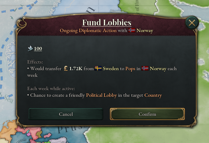 The precise effects of Fund Lobbies depends on whether a Pro-Country/Pro-Overlord lobby targeting the initiator already exists in the target country. If one does not exist, the money goes towards promoting the creation of such a lobby, with a weekly chance for this to happen. If such a lobby already exists, or once one is created, the pact switches to supporting that Lobby by increasing the Pop Attraction of Interest Groups that belong to the boosted lobby, which over time will increase the combined Clout of the Lobby’s Interest Groups, which in turn translates into greater mechanical effects and impact on AI decision-making.