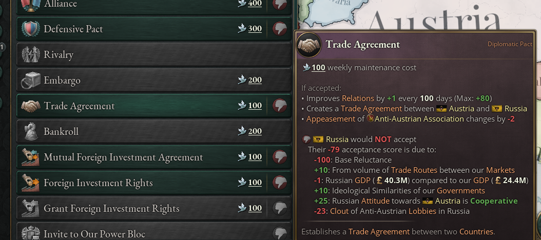 [i]Although Russia’s government currently has a positive attitude towards Austria and wishes to pursue closer relations, the powerful Anti-Austrian Lobby in Russia makes it more difficult for them to agree to any proposed new Diplomatic Pacts[/i]