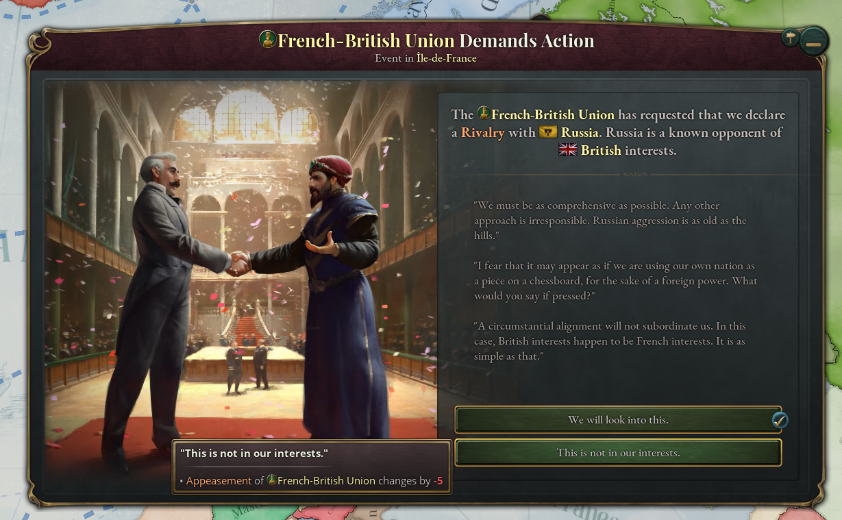 [i]Feeling that the French government isn’t doing enough to foster closer ties with Britain, the pro-British Lobby demands a grand gesture of enmity with Britain’s Russian enemy[/i]