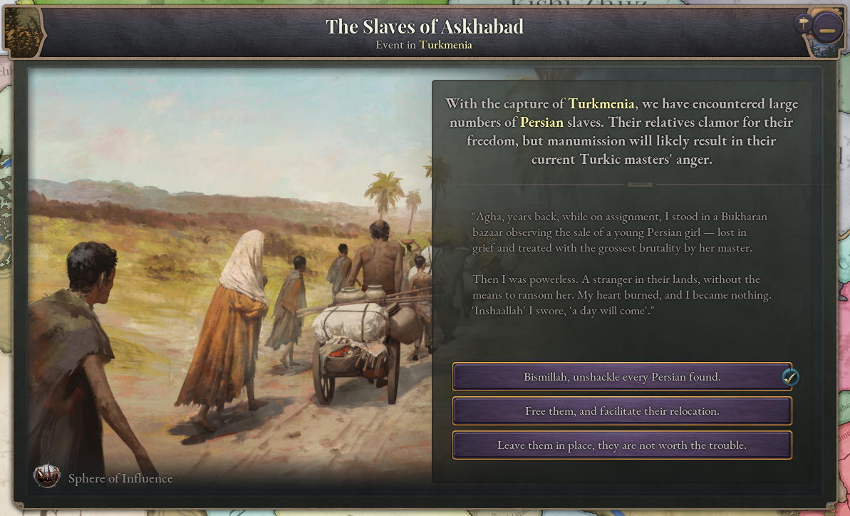 While expanding North and East, Persia will encounter the massive slave markets of Turkmenia and Uzbekistan, and be faced with the need to either free the slaves or allow them to remain in captivity.