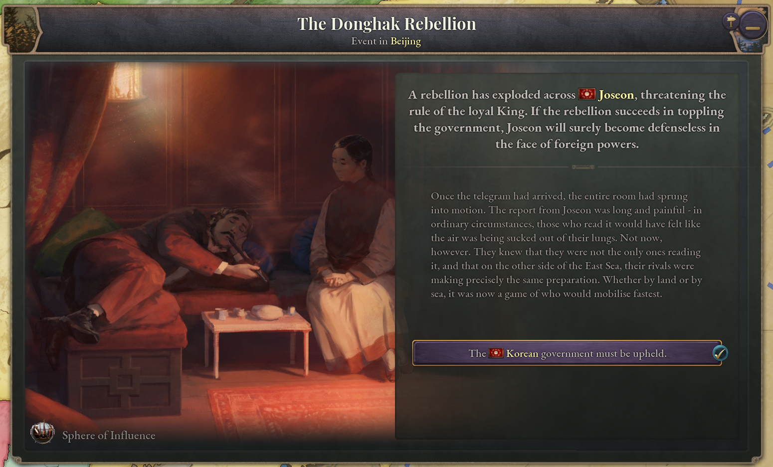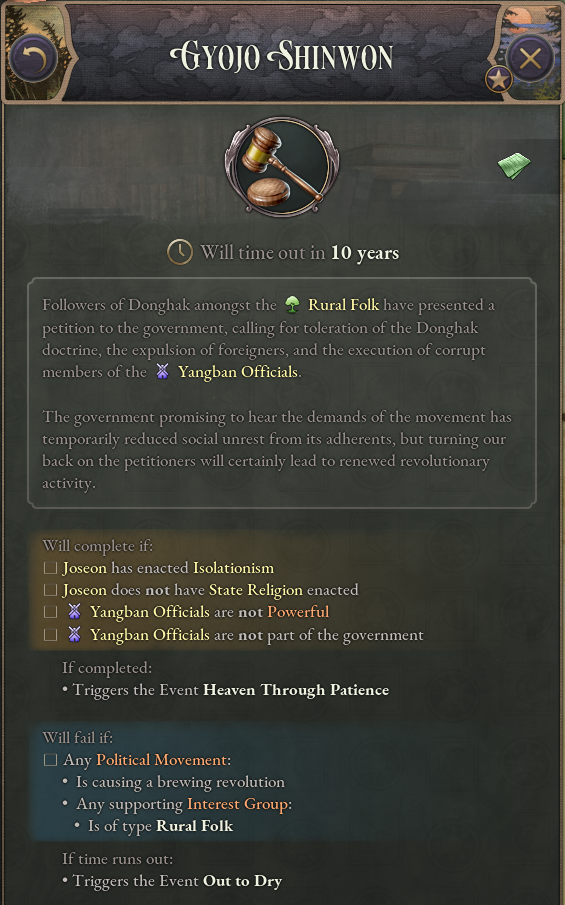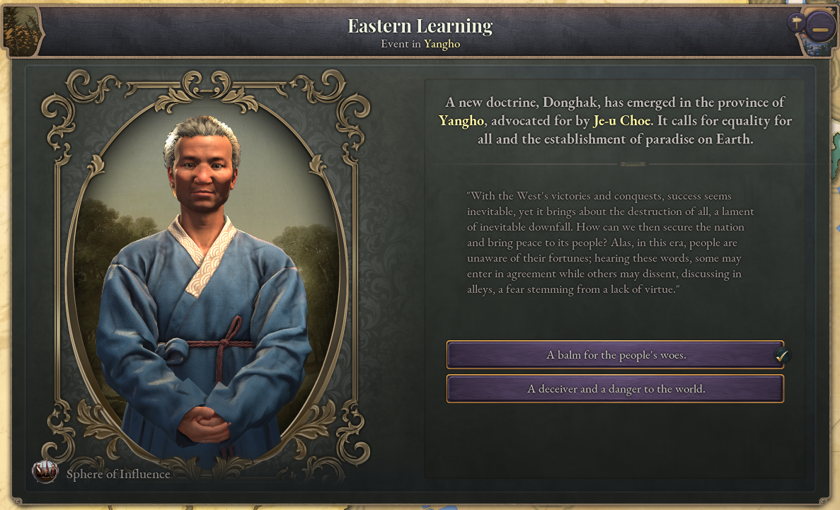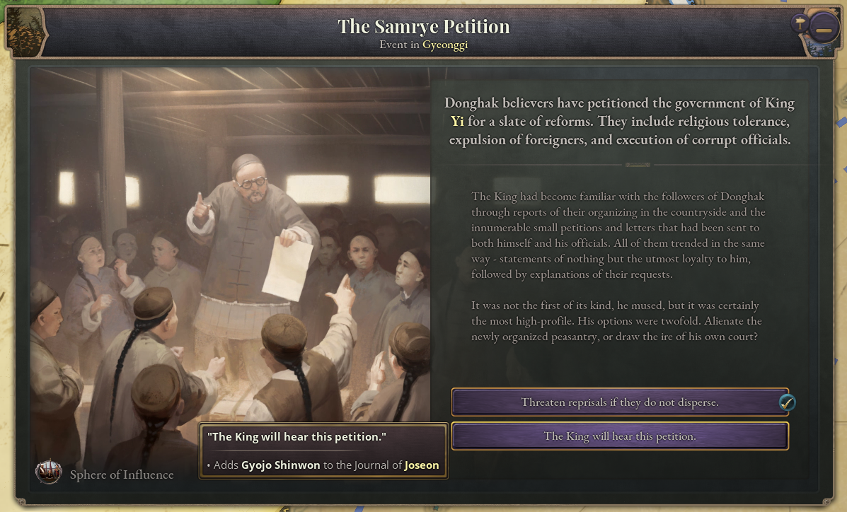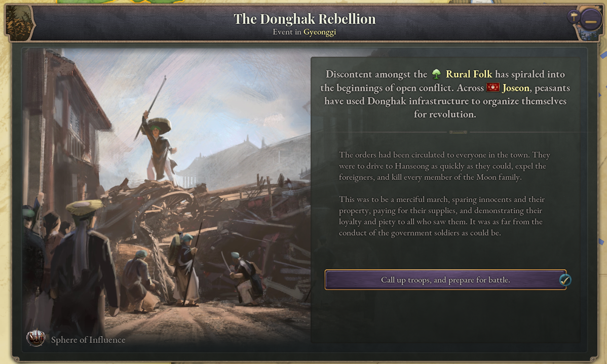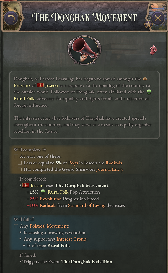 To represent Korea’s isolation from the world during this period of the Joseon Dynasty, Korea has been given the Isolationism law at game start. Once this law is replaced by a different trade law, a sufficient degree of turmoil builds up, and the effects of foreign influence begin to be felt in Korea, a new journal entry will appear. The Donghak Movement journal entry represents the hybrid religious-political peasant movements that occurred in Korea around the late 19th century. Whilst it is active, revolutions involving the Rural Folk will be greatly strengthened.