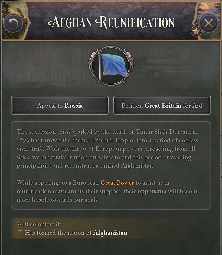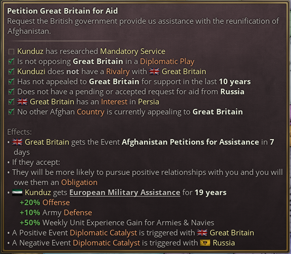 This journal entry allows all Afghan contenders to appeal to either Russia or Britain for military and diplomatic support in reunifying Afghanistan. If the relevant Great Power approves the contender’s request, they will be more inclined to support said contenders in diplomatic plays, and the contender will receive military bonuses in return for an obligation.