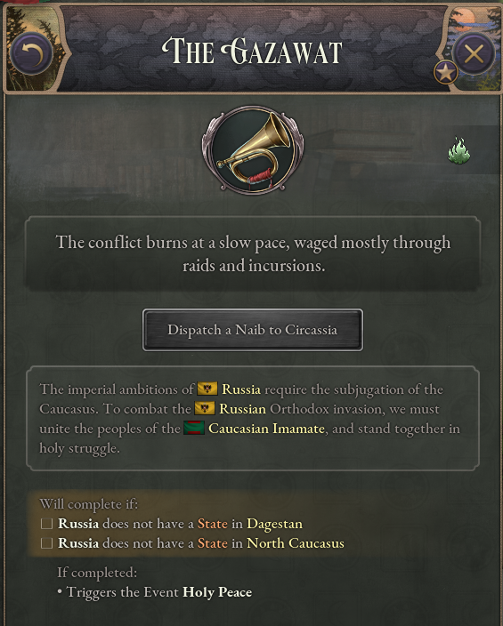 Once Circassia’s starting leaders have died, the Imamate may use this journal entry to dispatch a leader to Circassia, fostering a formal alliance between both states.