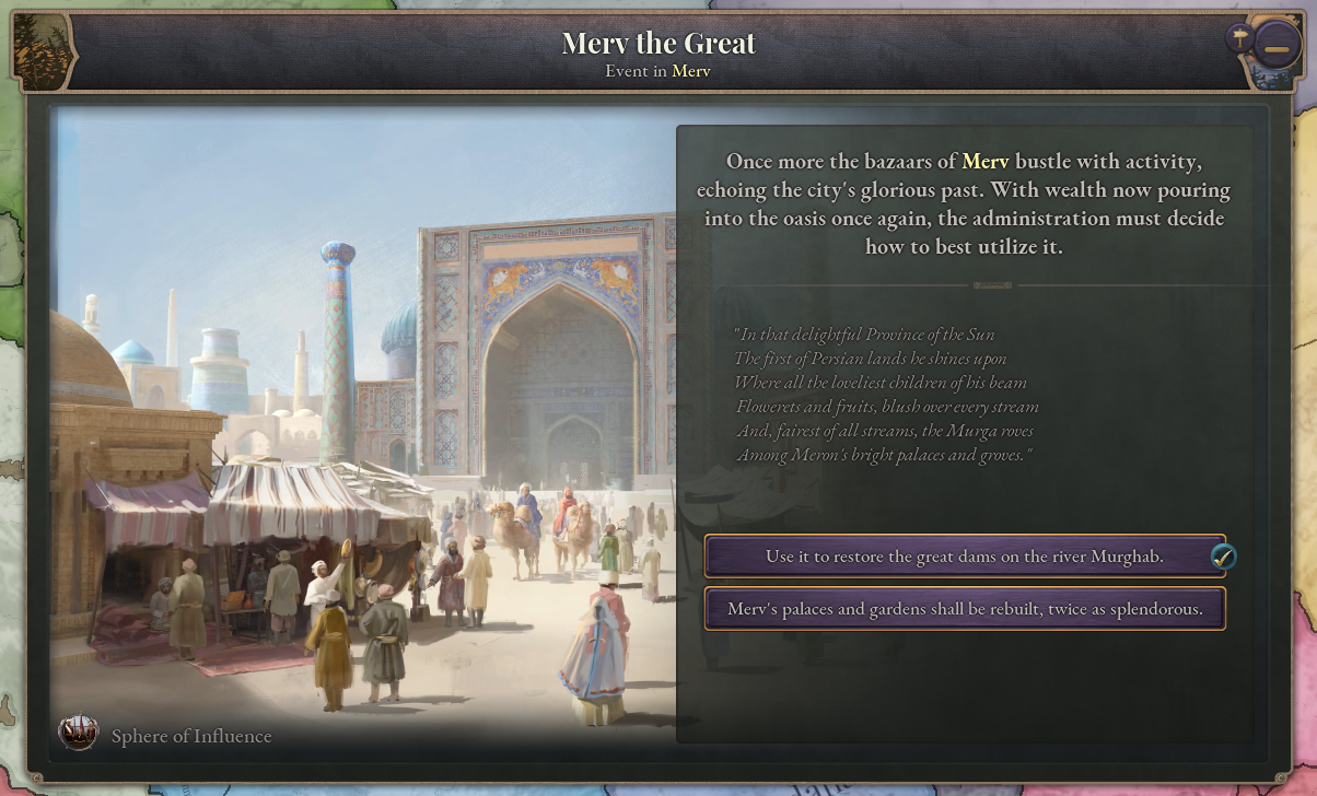 Additionally, Persia will have the opportunity to restore the great city of Merv, formerly one of the largest cities in the world before its desolation by Tolui Khan.