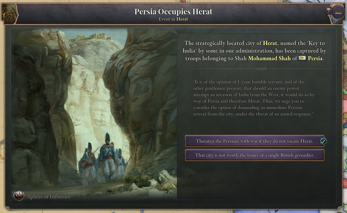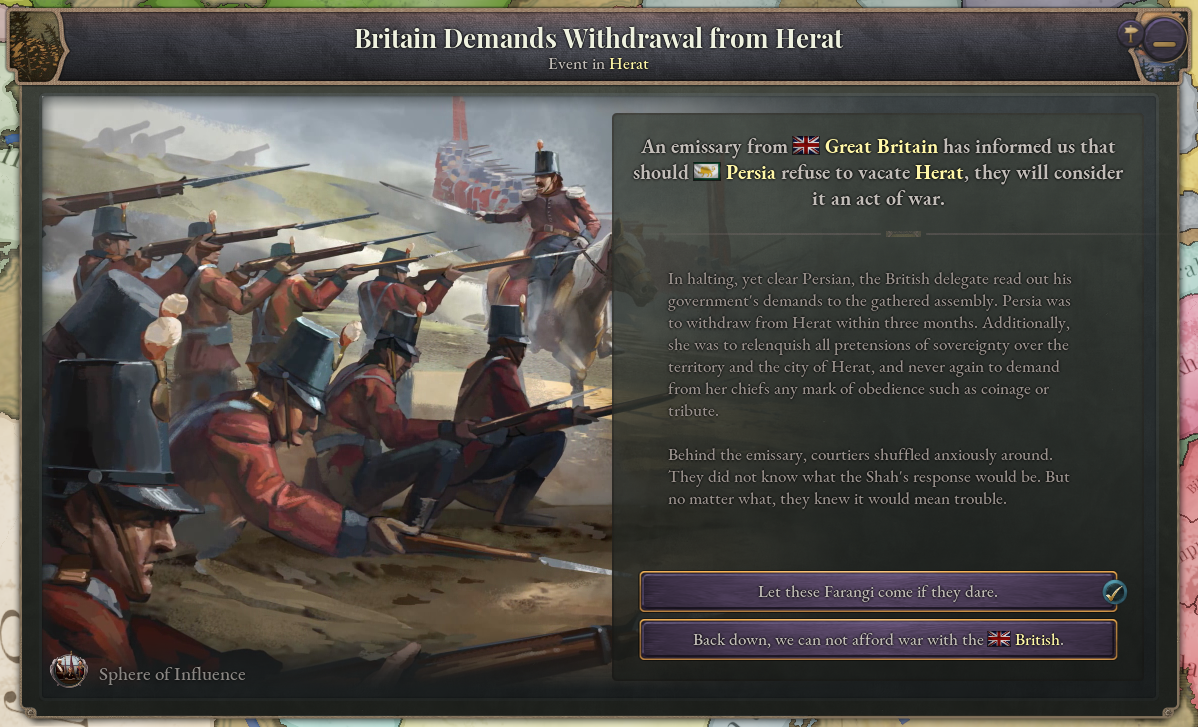If Persia occupies Herat, Britain will be warned, and will have the opportunity to demand that Persia withdraw from the region. If Britain sends the demand and Persia chooses to back down, this will represent a major humiliation setback in its expansionist ambitions. If Persia refuses to back down, Britain will become much more hostile towards Persia, and represent a major impediment to its future efforts.