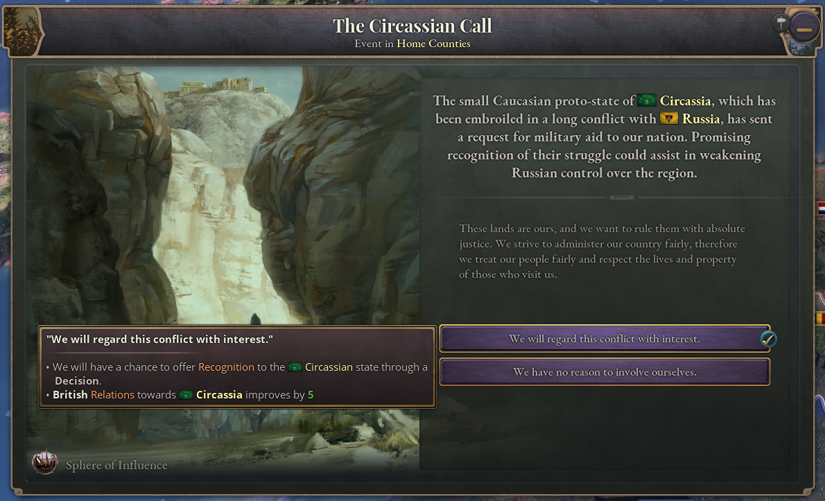 Foreign powers with an interest in the Caucasus region will receive the option to offer recognition to Circassia upon the conclusion of its war with Russia, as well as becoming more inclined to support it in a defensive war.