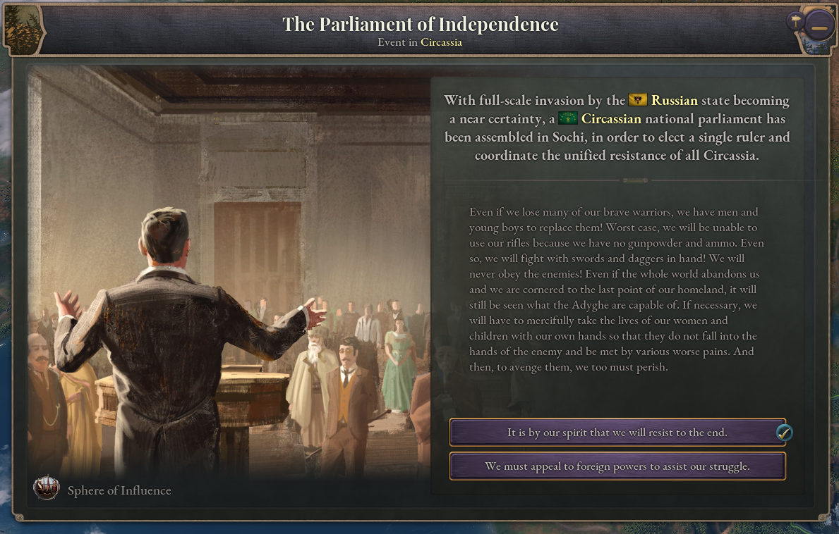 Upon either the expiration of the truce between Circassia and Russia–or Russia’s escalation of the war using its Caucasian War journal entry–Circassia receives an event representing the historical Parliament of Independence in 1861. This event offers the opportunity to either focus on modernising the military in preparation for a Russian invasion, or appealing to foreign powers for recognition and support.