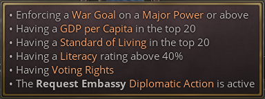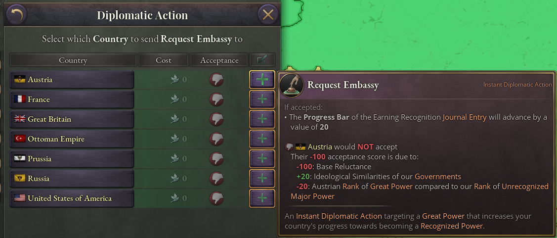 The Request Embassy Diplomatic Action is unique to this journal entry, and permits for requesting embassies in Great Powers. Each Great Power that is willing to accept an embassy will raise the progress towards Recognised status by 10%.