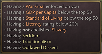 If a movement involving the Rural Folk becomes revolutionary, the Journal Entry will fail, and massively escalate both the radicalism of the movement and the progress of the revolution. What would formerly have been mere civil unrest will transform into a near-guaranteed civil war–one which could run the risk of a foreign intervention which would be disastrous for Korea.
