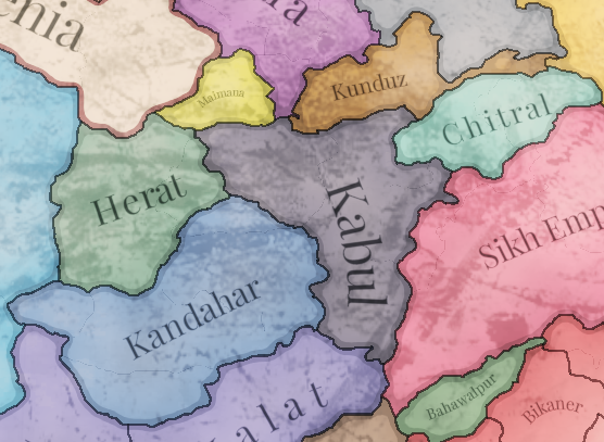 Afghanistan in 1836 is far from a united land. The slow collapse of the Durrani Empire has left it in a state of civil war for decades, with the primary claimants to the throne forming fiefdoms centred in Herat, Kabul, and Kandahar. In addition to this unfortunate internal situation, the Afghan states find themselves menaced by Persia’s expansionist ambitions from the West, the encroaching British East India Company from the East, and Russian influence from the North.