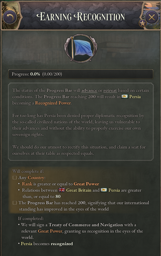 The “Earning Recognition” Journal Entry permits an unrecognised major power to work towards the status of recognised nation. This journal entry replaces the currently existing Force Recognition wargoal–whilst defeating the Great Powers in wars still benefits an unrecognised nation immensely, it is not a one-and-done path to being regarded as an equal.