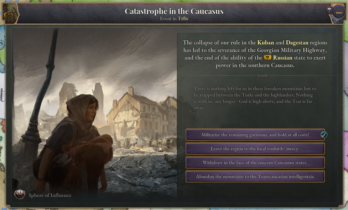 In Sphere of Influence, both of Russia’s opponents in the Caucasian War–Circassia and the Caucasian Imamate–receive journal entries to represent their role in the conflict. In the case of Circassia, this journal entry is completed by expelling the Russians from Kuban and achieving the borders claimed by the Circassian parliament.