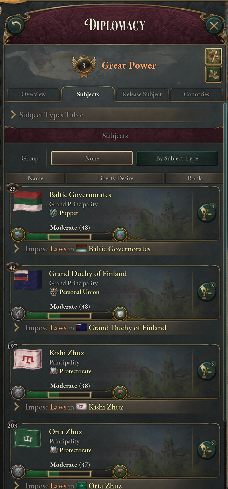 A lot of new interface assets have been made to accommodate the new features and functions of the Subject Improvements, the new Lobbies as well as the Diplomacy improvements.