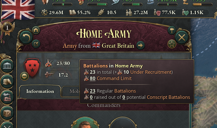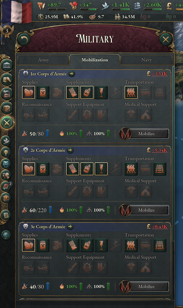 We're working on several improvements in these areas, mostly pertaining to military matters. A few things you can expect on the UI front in 1.5.9 includes: [i]Added a new Mobilization Tab to the Military Panel. It gives you an overview of the Mobilization Options for all of your Formations, and allows you to customize them.[/i]