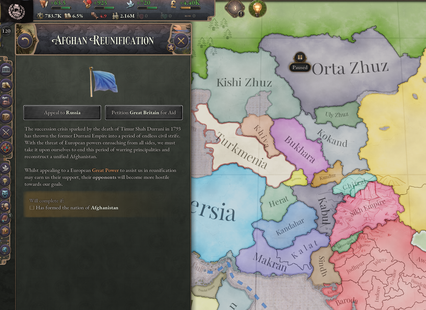 The Great Game is a major new content addition adding a new Objective and new Journal Entries focused on the historical Great Game that played out between Russia and Britain in Central Asia. The Objective can be played as either Russia/Britain or one of the other involved powers such as Persia, and which country you select changes the conditions required to ‘win’ the Great Game. The new Objective ties directly into numerous new Journal Entries such as Persia’s ambition to restore its hegemony over Afghanistan, most of which will be present even if the Objective isn’t selected and so will also drive AI behavior in the region. [i]As one of the Afghanistani minors, your most immediate priority will be to reunify Afghanistan and either restore the Durrani Empire or create something new[/i]