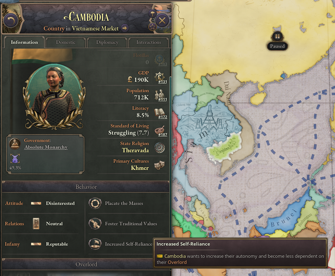 Update 1.7 adds Liberty Desire for Subjects that restricts both which actions they can take against their overlord and which actions an overlord is able to take against them. Liberty Desire is calculated on a variety of factors, such as how intertwined the subject’s economy is with their overlord, and can increase or decrease over time. AI subjects will have a number of new diplomatic strategies influenced by their liberty desire, such as pursuing independence or remaining a subject but seeking greater autonomy from their overlord. [i]Owing to a relatively high level of Liberty Desire, Cambodia is pursuing a strategy of increased autonomy and self-reliance, but will not seek full independence yet[/i]