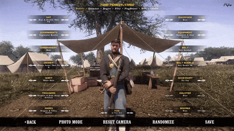 - Added the first implementation of uniform customization, featuring 8 fully customizable regiments: 6th Wisconsin, 69th New York, 72nd Pennsylvania, 8th Ohio, 1st Texas, 6th Louisiana, 3rd South Carolina and 27th North Carolina. Additionally, a photo mode to let your artistic talents fully capture your custom character in the way you want.
