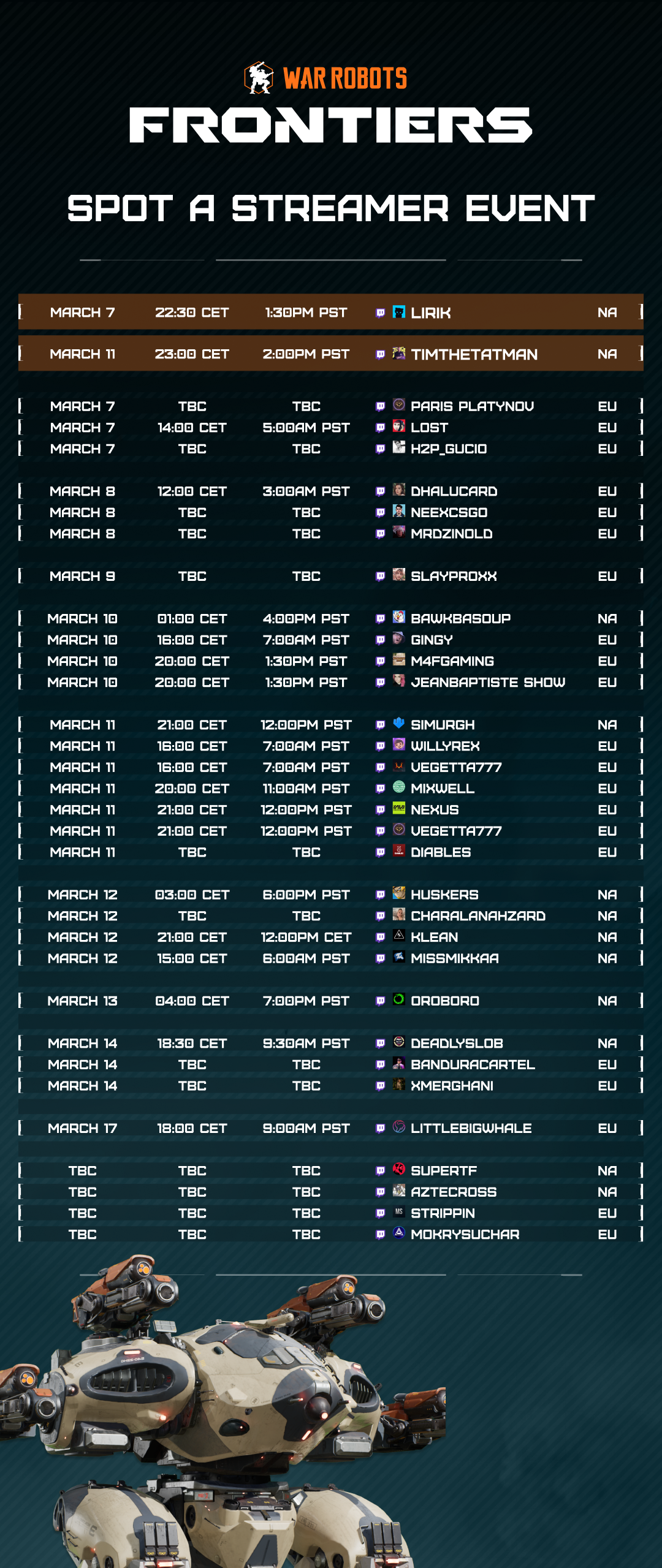 [b]If the Content Creator is streaming outside of the times mentioned and I get into a match with them, do I still get a reward? [/b] [i]No, but check to see the times they are active during this event. If Content Creators overrun their assigned time, you will still be eligible to receive rewards in this case. [/i] [b]How do I enter a match with a Content Creator?[/b] [i]Simply join the matchmaking queue for a chance to get into the same match as a Content Creator. Make sure you’re playing on the same server! [/i] [b]What types of matches are considered valid for Spot a Streamer?[/b] [i]To receive the Participant Reward: You will qualify if you play a match during the designated timeframe. To receive the War Robot Reward: You will qualify for the event if you match with a Content Creator provided in the listing and participate in a match during the designated timeframe. You will still be qualified for this event regardless of whether you are on the allied or enemy team of the Content Creator as long as you matched with them during the event timeframe.[/i] [b]How do I know if I matched with the Content Creator successfully within the designated time frame?[/b] [i]The list of participating Content Creators can be found in the list above. As long as you get into a match with them during the designated event time frame, you will be considered eligible to receive a prize. You can also watch the livestream of eligible Content Creators to check if you successfully matched with them during the timeframe.[/i] [b]Do I need to be on the same team as the Content Creator?[/b] [i]No. As long as you are in the same match, regardless of what team you’re on, you are eligible to receive the prize.[/i] [b]Can I match the Content Creators across different servers?[/b] [i]No, you must be on the same server to be able to match against them.[/i] [b]Do I have to play the whole match?[/b] [i]Yes. We would like to encourage players to play matches fairly and participate actively in the battle by aiming for the match objective with their team. As part of match verification, the team will be reviewing match activity logs and leaver logs to determine if the match was paired fairly and as intended.[/i] [b]Do I have to win the match?[/b] [i]No! Winning a match is NOT a requirement to receive any of the rewards.[/i] [b]How can I know if I am qualified to receive a Participation Reward?[/b] [i]You play during the designated event timeframe. Make sure to check your time zone! [/i] [b]How can I know if I am qualified to receive a War Robot?[/b] [i]You will receive an in-game news pop-up once the event has concluded on March 24th at 10:00 CET. Please remember to check your Notifications if you missed it. If you receive this pop-up, we highly encourage you to complete the questionnaire promptly and select your War Robot reward. Players who do not fill the survey will not receive their reward. The War Robot rewards will be sent at the end of the event on April 3, 10:00 CET.[/i] [b]If I match with multiple Content Creators, can I receive multiple War Robots?[/b] [i]No. Each player can only receive one War Robot from the entirety of the event. [/i] [b]I play on Console, can I join this event?[/b] [i]Yes! Players who play War Robots: Frontiers on Xbox or PlayStation can participate as long as you have enabled cross-platform play to engage in a quick match. Console players, please check the following steps to make sure you turn this function on:- [b]PlayStation: [/b]Cross-play is enabled by default.