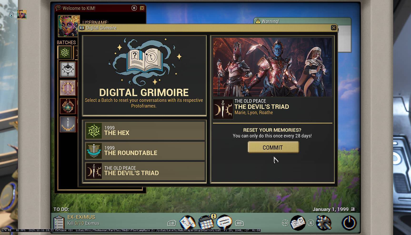 With The Devil's Triad romanceable, new opportunities for connection abound. If you've completed The Hex Quest (and at least one level of The Descendia), you can access conversations with the new Protoframes through the familiar KIM interface from Warframe: 1999 — rebranded here as [b]GIM[/b]. Progress your relationships with them simply by talking — no gift-giving or Syndicate Rank requirements here! While you won't be able to enjoy a New Year's kiss with Marie, Lyon or Roathe, you can go on dates with them in special Captura Scenes (and take photos to savor the memories).