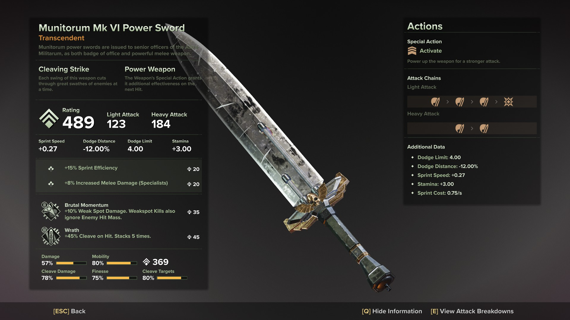 We have added a second weapon special activation action in the attack chain of the power swords. This new activation allows the player to continue an attack chain if using the weapon special in the middle of one. This mid chain activation was added to allow for a more varied attack pattern even with frequent use of the weapon special.- [b]Munitorum Mk III Power Sword[/b][list]