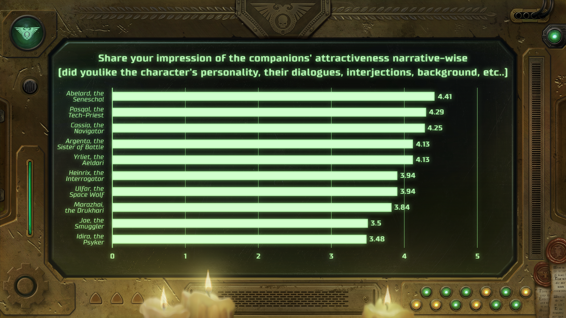 We've asked you before to share your first impressions of the companions, and the poll results were quite unambiguous: Argenta led in every category! Although she's still a favourite, the Lord Captain has by now had the opportunity to form a more comprehensive picture of their retinue's other members. This time around, we looked at the following criteria in our companions: interesting story, dialogue, and interactions; mechanical efficiency; best romance; and most attractive. Let's go through these in order. The Rogue Trader's loyal Seneschal emerged as their most interesting companion. This choice surprised us and would probably surprise Abelard himself! He'd most likely be flattered too. Pasqal's [i]multifaceted[/i] personality also got its fair share of attention.
