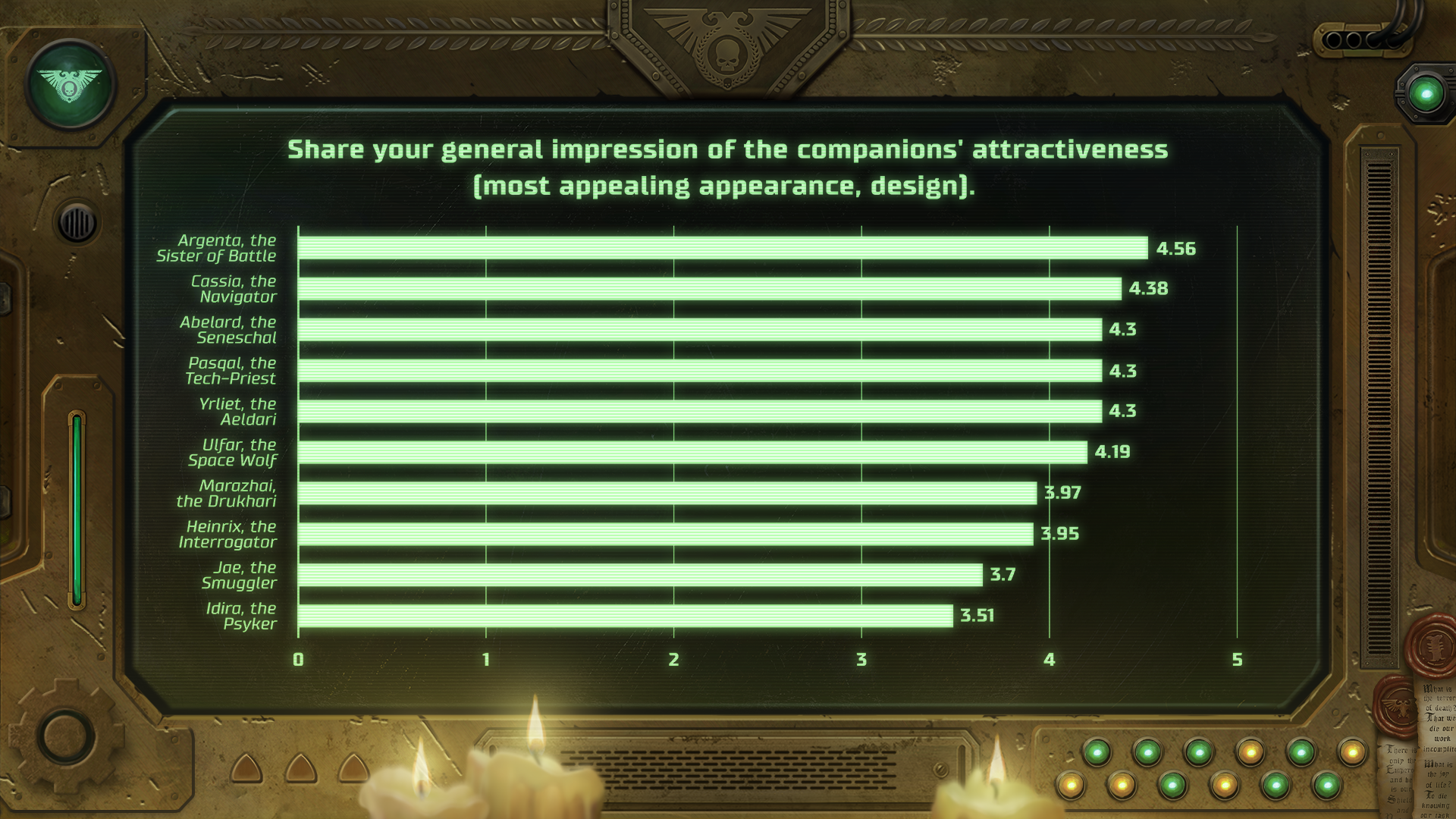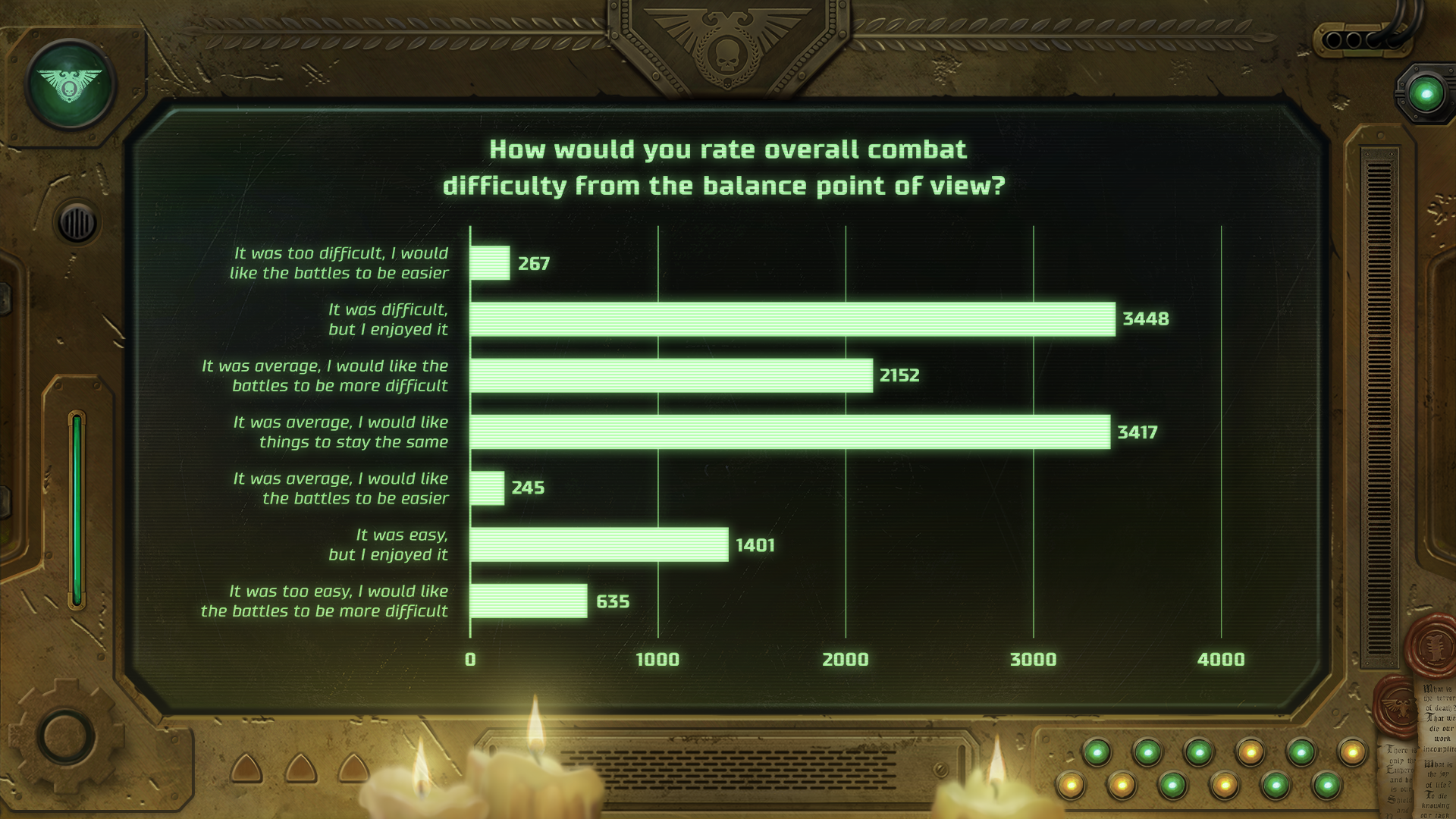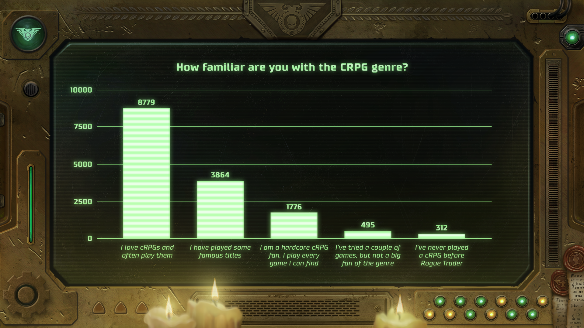 We knew that releasing a game in the Warhammer 40,000 universe meant submitting it to the scrutiny of demanding critics. A mere 7% had no or only cursory experience with the setting. We enjoy assuming the role of guides on the journey to the dark future, and we are proud to say that players trust us with the job: a whopping 96% of captains had their expectations of the setting's atmosphere met, to the incredible delight of the Warhammer fans among the game's creators. But enough bragging! On to the more fascinating facts, as well as some disconcerting ones.