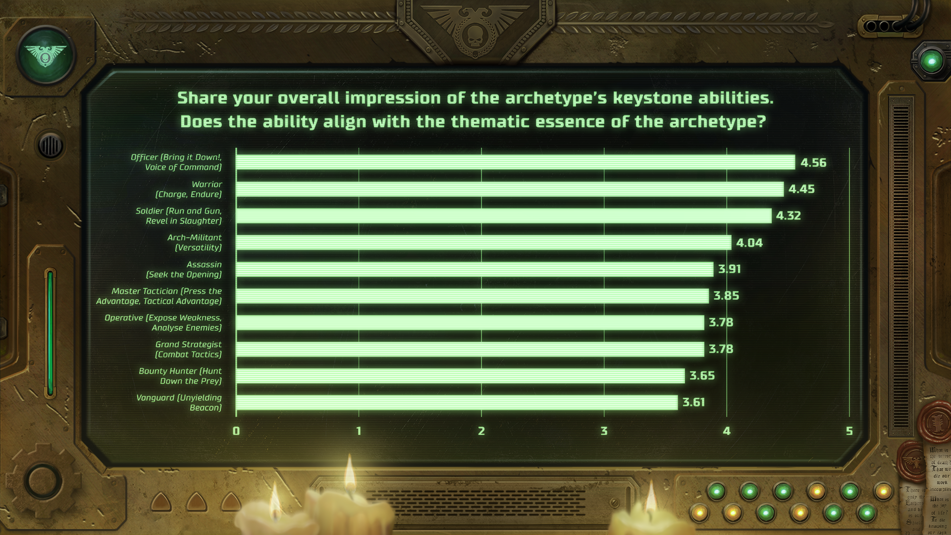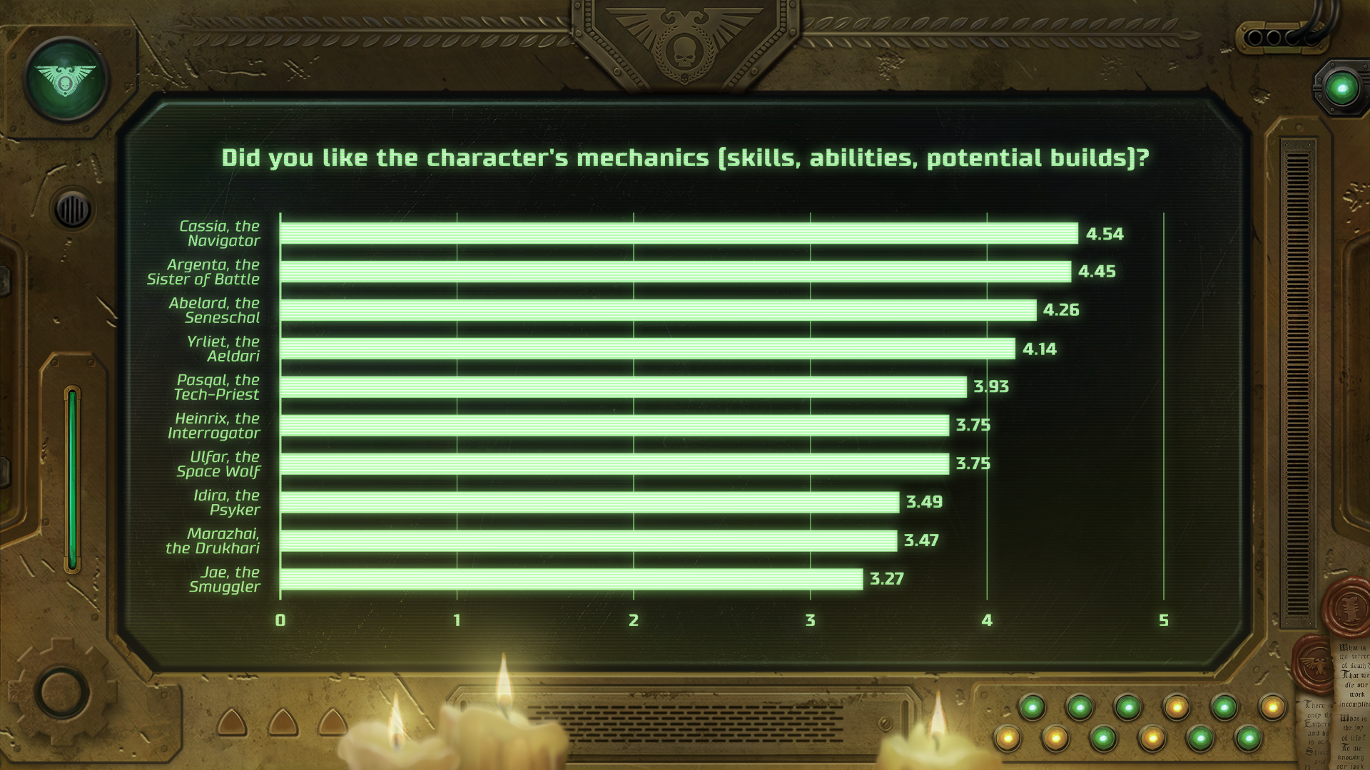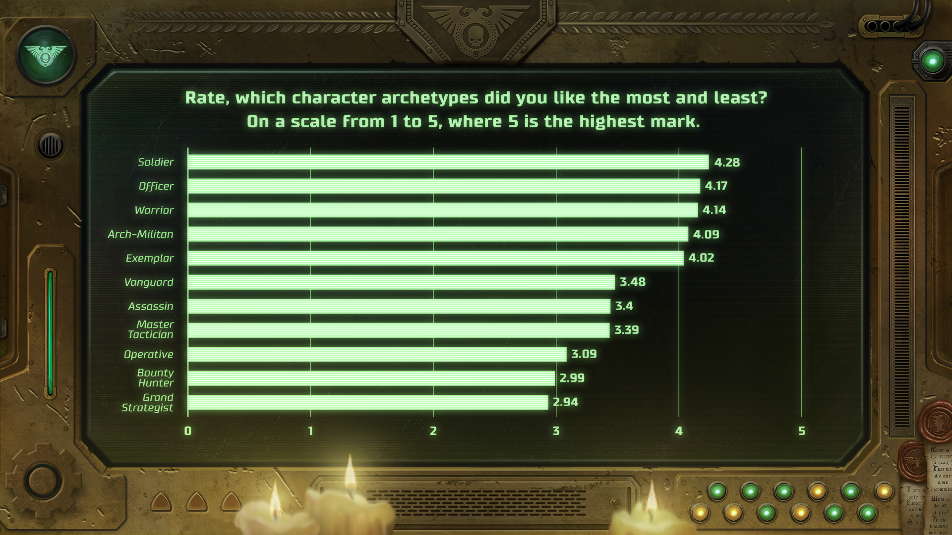 While picking through loot was a mostly unrewarding experience, obtaining it was quite another matter. On average, players gave the ground-combat system 4.3 points out of five, which surpassed the Beta rating for this metric. 57% of participants thought the Lord Captain had been through just the right number of ordeals. Among the rest, opinions were split between those who'd prefer more ordeals and those who envisioned a more peaceful life for the protagonist. Luckily for the Rogue Trader, the well-wishers outnumbered the daredevils nearly two-to-one. We'd always known that Warrants of Trade were granted only to Humanity's bravest. But this time, they showed themselves to be quite deft as well. Players who opted to skip the character-build part and go straight for the Story mode were satisfied with the challenges they faced. For their part, those who started the game on a higher difficulty level would’ve preferred to challenge yet fiercer foes than the ones they actually encountered. Indeed, the higher the difficulty a player selected, the likelier they were to report a dearth of worthy opponents. Worry not! Our latest major update has made significant changes to the balance of archetypes. Perhaps now the Imperium's enemies will present a serious hurdle in your path.