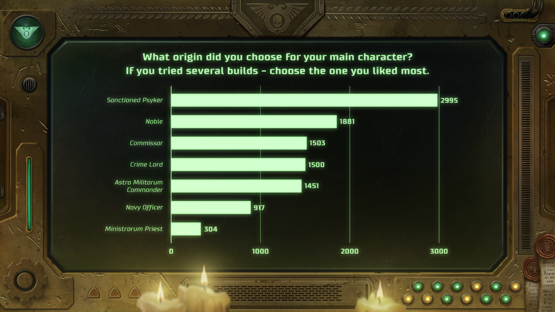 Creating and customising a character is a key aspect of any role-playing game. To make sure no Rogue Trader lacked in individually tailored options, we added over 500 talents to the game! Many players hinted that we might have tried too hard there... Thus 37% of participants would have liked the options to be fewer. The same percentage said the number of options matched their expectations. There were also those who didn't find enough variety, but the former two outnumbered these four to one. As for the Rogue Trader's Origin, the majority's preference leaned firmly toward Sanctioned Psyker. Voidborn Psyker was therefore the most popular combination, ahead by almost a third of the runner-up, Imperial World Noble.