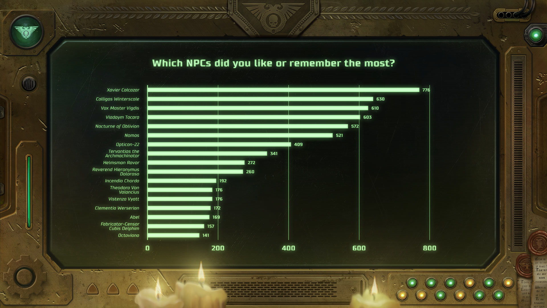Now what about those who can only be observed from the sidelines? We left this as a free-form question so that participants could name whatever non-player character they wanted as their favourite. After meticulously sifting through over 5,000 comments, we had the following top ten: a Koronus Expanse All Stars according to the heir of House von Valancius.
