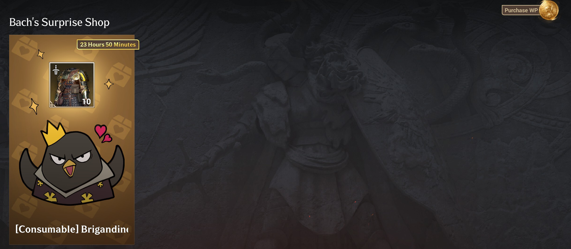 - Access [Bach's Surprise Shop] through the 'Shop' tab during the event. - Items can be purchased without the use of WP. The items on sale change every morning at 9:00 AM. - Each item can be purchased once per account.■ [Bach's Surprise Shop] Item List