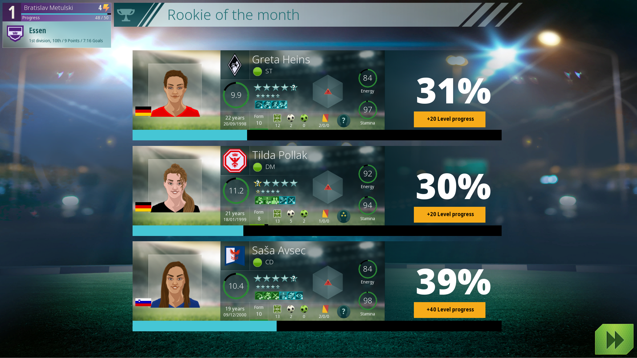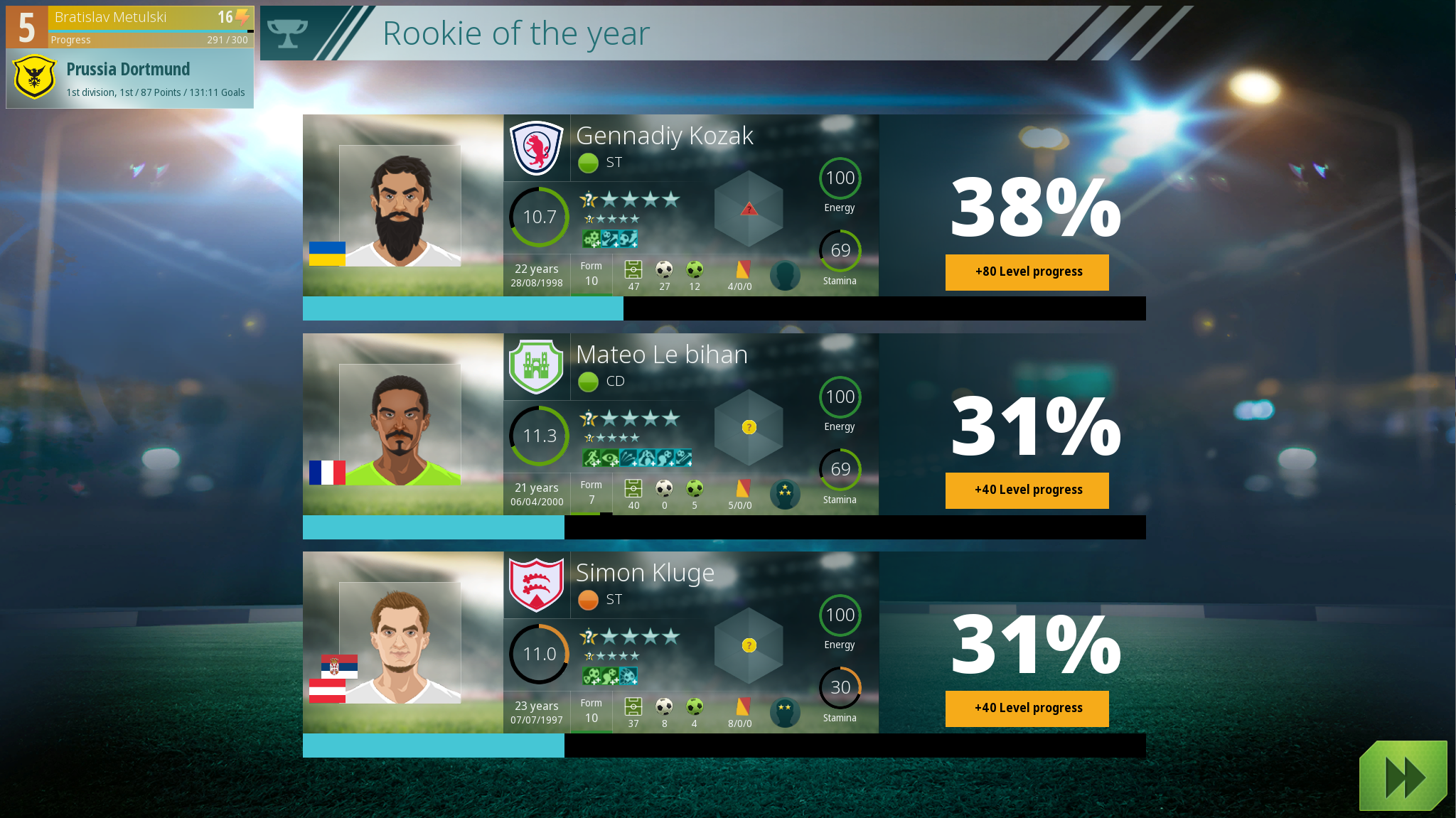 - Rookie of the month and rookie of the season (only under 24 years and first season in the league, with bonus points for level progress for the selected players and the winner)