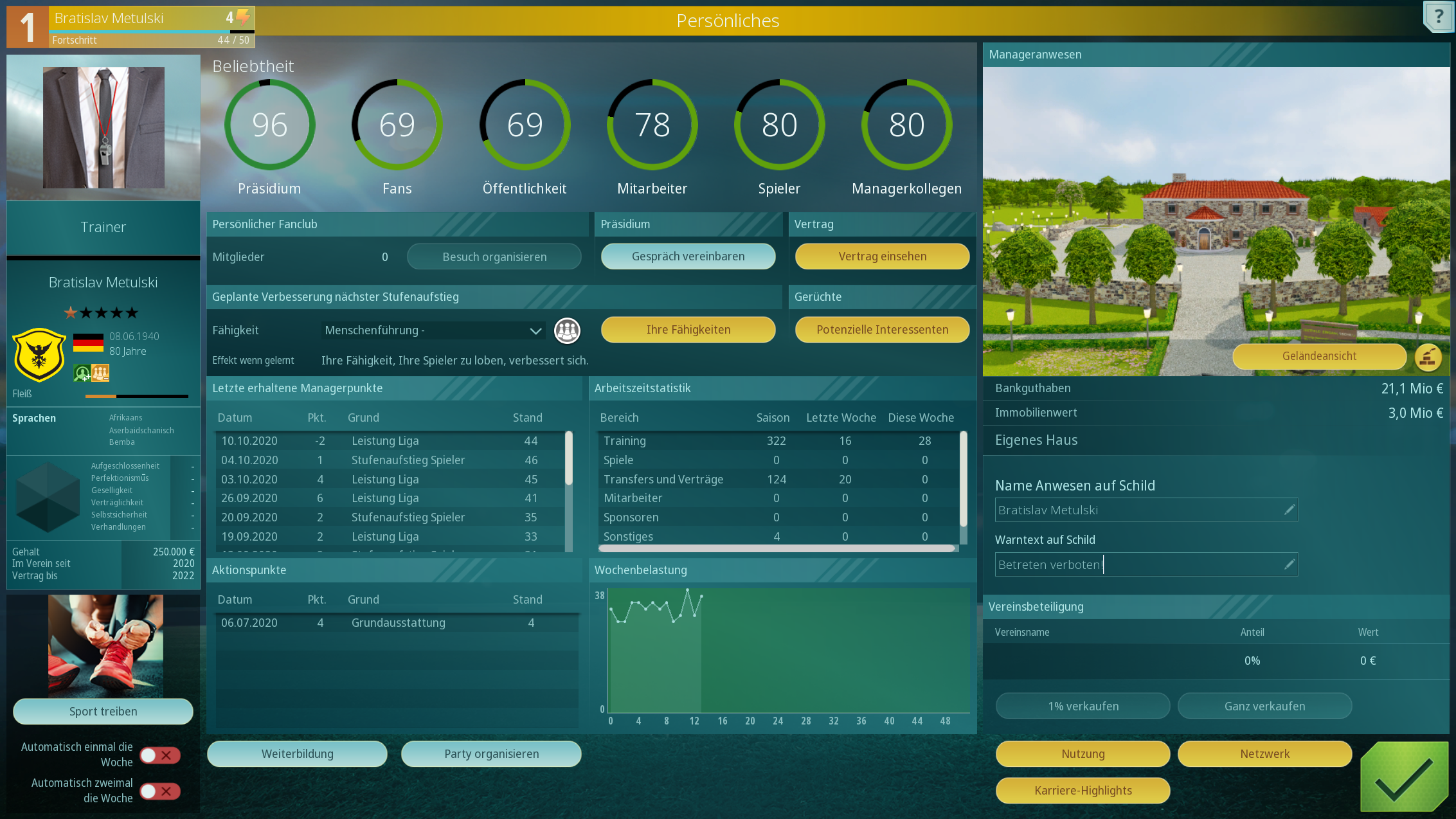 2. Manageranwesen: Unter Persönliches gibt es jetzt rechts den Bereich "Manageranwesen". Hier hat man die Möglichkeit, ein mondänes Eigenheim direkt am Vereinsgelände zu bauen. Vom luxuriösen Haus auf Stufe 1 bis zur prunkvollen Residenz auf Ausbaustufe 3!