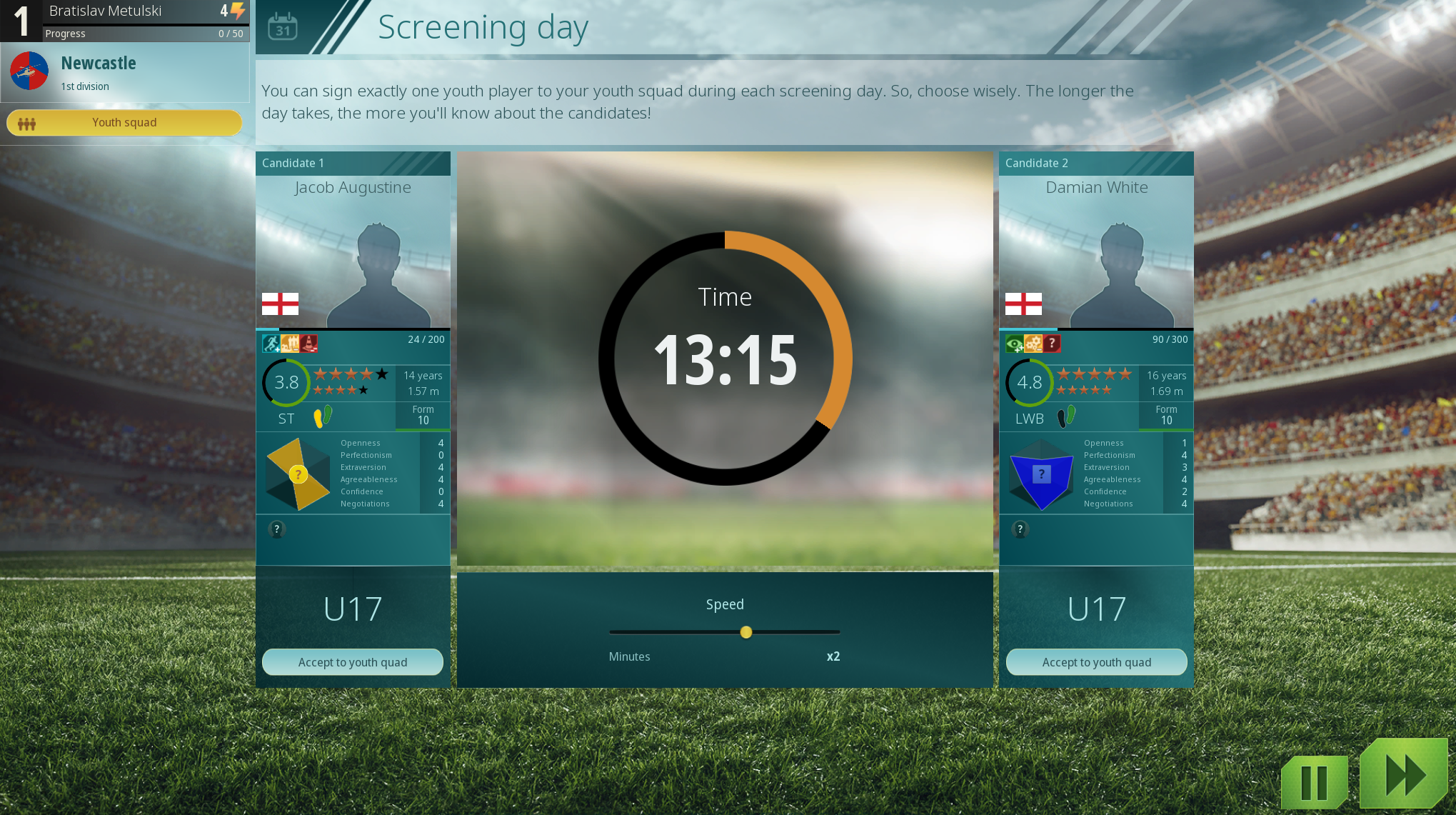 [b]SICHTUNGSTAGE[/b]: Je Halbjahr kann man jetzt über die Jugendabteilung einen Termin für einen Sichtungstag für Jugendspieler setzen. An dem Tag werden dann zwischen 8.00 und 16.00 Uhr abwechselnd Spieler angezeigt, von denen man einen dann direkt verpflichten kann. Am Anfang des Tages sind die Spieler noch komplett ungescoutet (bis auf den Stärkewert), wohingegen die letzten Spieler am Ende des Tages komplett gescoutet gezeigt werden. Man muss also abwägen, ob man mit einer Verpflichtung früh zuschlägt oder auf bessere Spieler mit höherer Scoutingstufe spekuliert.