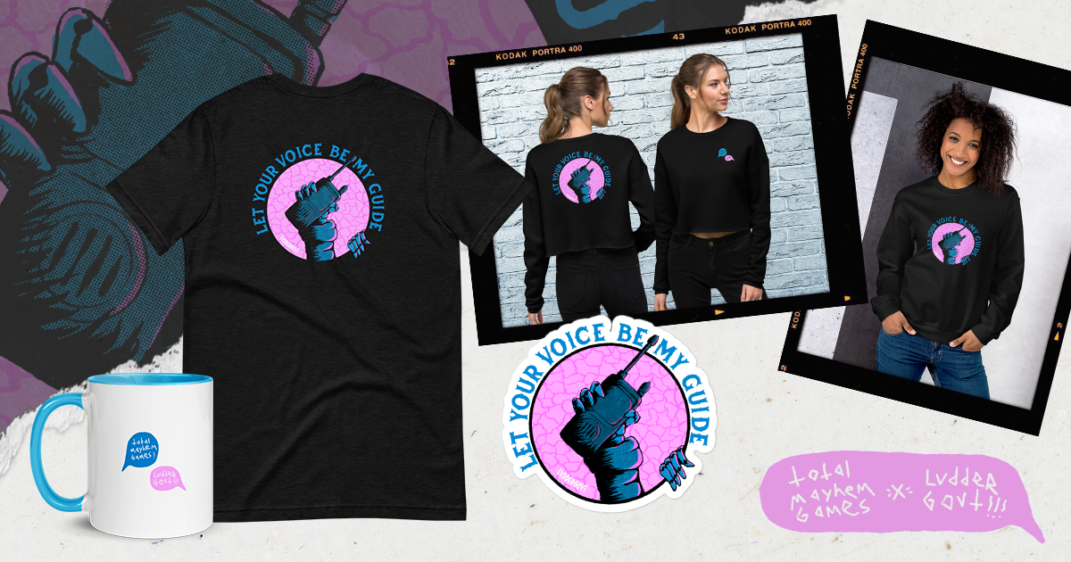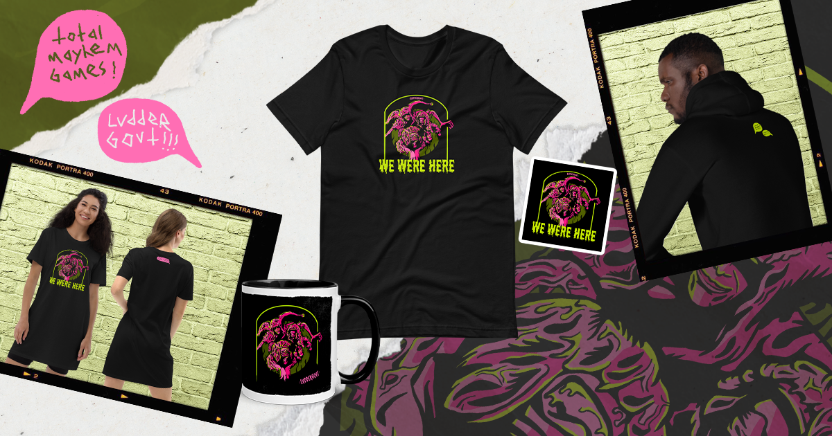 These are all part of our special [url=https://www.totalmayhemmerch.com/tmg-goodies]TMG x LVDDERGOVT collection,[/url] produced in collaboration with contemporary artist LVDDERGOVT!