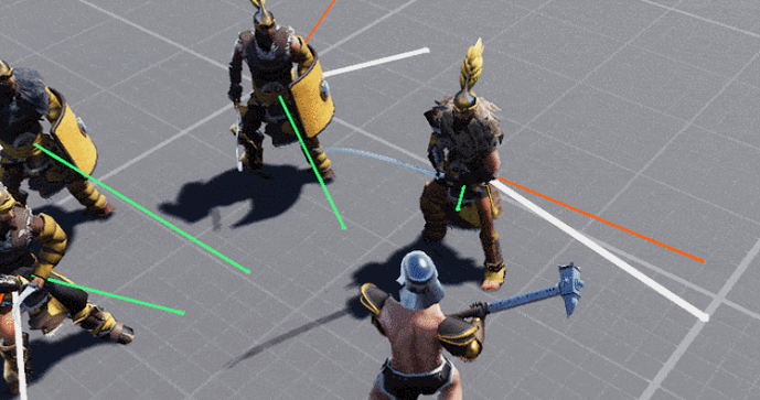We gave each NPC two rules to follow: They have to separate from their allies (red line) and seek their target (green line). Blending these two behaviors (white line), results in an emergent surround and much smarter and less reckless movement.
