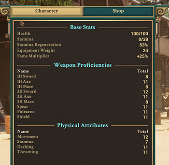 The Spectacles Update introduces a [b]Skill Overhaul[/b]. It tweaks and changes almost every area related to skills. The way Skills actually affect [b]combat[/b], [b]AI skills[/b] balance and how [b]training [/b]affects skill have been balanced/adjusted. One big thing we wanted to do is make [b]Stamina less dominant[/b] as a skill. While still important, Stamina is now less frustrating and overwhelming in combat, assuming you keep an eye on your character's loadout and general situation. In the Armory, you can now switch between the Shop and the [b]Character Overview[/b] panel, which is a nice QoL feature. This overview shows your characters current status.