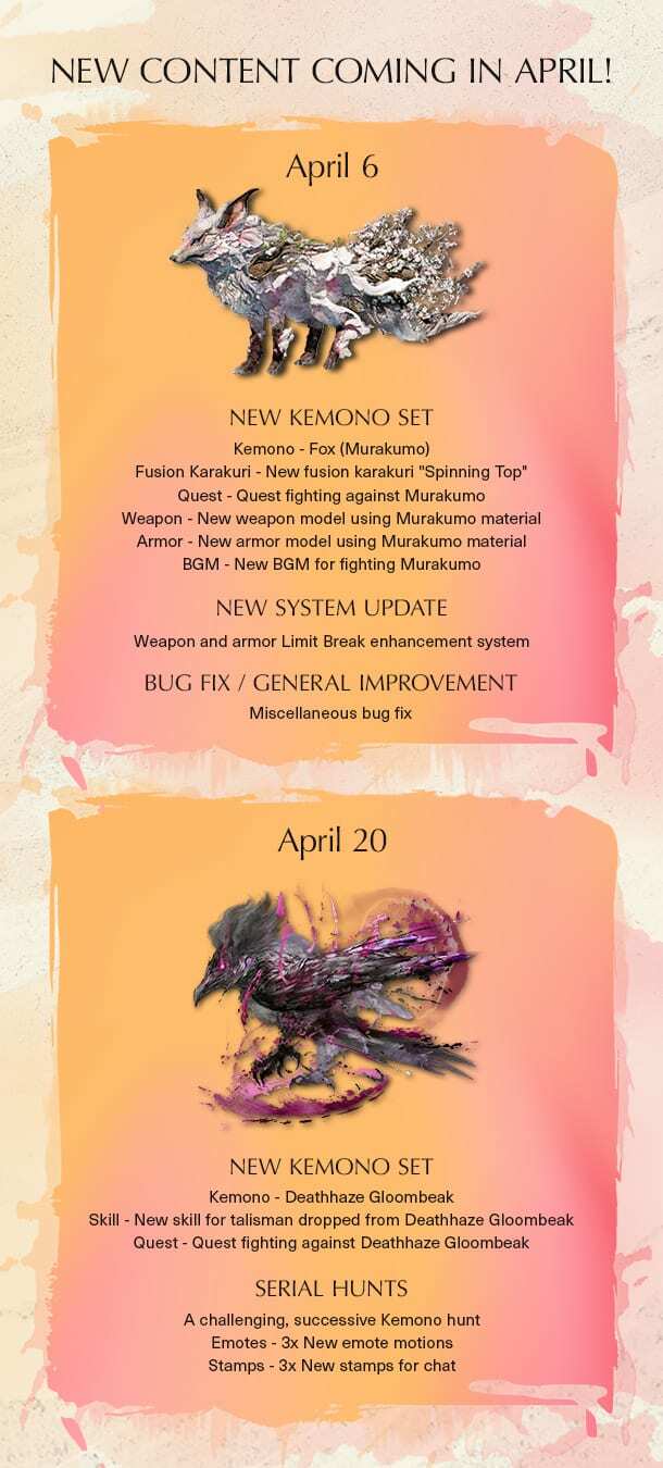 Later this month you can face off against the dire Deathhaze Gloombeak – a new breed of volatile Kemono. And take on “serial hunt” special quests, where you'll be forced to hunt a succession of Kemono, each within a set period of time. Between each individual hunt, you will not be able to collect Healing Water from the surrounding area. So with chances to recover limited, you'll need to pay close attention to your health. Each time you successfully down a target, your promised reward increases. However, if you fail at any stage of the hunt, you receive no reward at all.