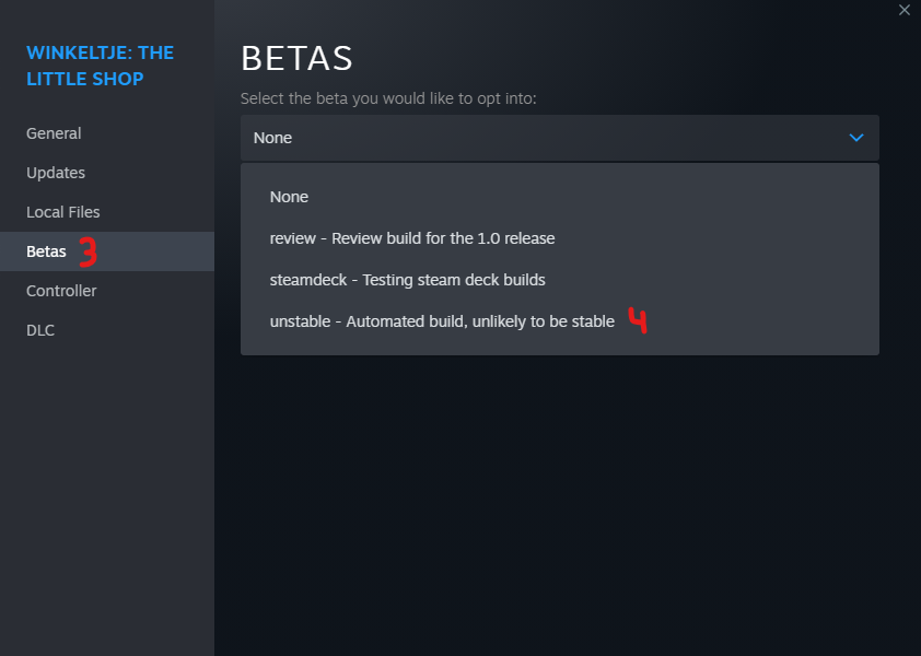 Trying out the new update is easy! Just head over to Steam and find Winkeltje: The Little Shop in your Library. From there:[olist] [*] Find the settings button or right mouse click on Winkeltje: The Little Shop [*] Go to 'Properties' [*] Go to 'Betas' [*] Select 'Unstable' [*] Play Winkeltje [/olist] To automatically notify us of error messages and crash data please opt-in to sending data in the settings menu. For any other issues or feedback, we are very active on Discord at: [url=https://discord.gg/winkeltje]https://discord.gg/winkeltje[/url] On Discord, hit the "Click Me!" button to become verified. This obstacle is unfortunately necessary to make it harder for spammers and scammers to join. This is also an excellent moment to update the community driven translations. [url=https://steamcommunity.com/app/949290/discussions/0/3774483849440676174/]Click here to find out how you can participate in community driven translations.[/url]