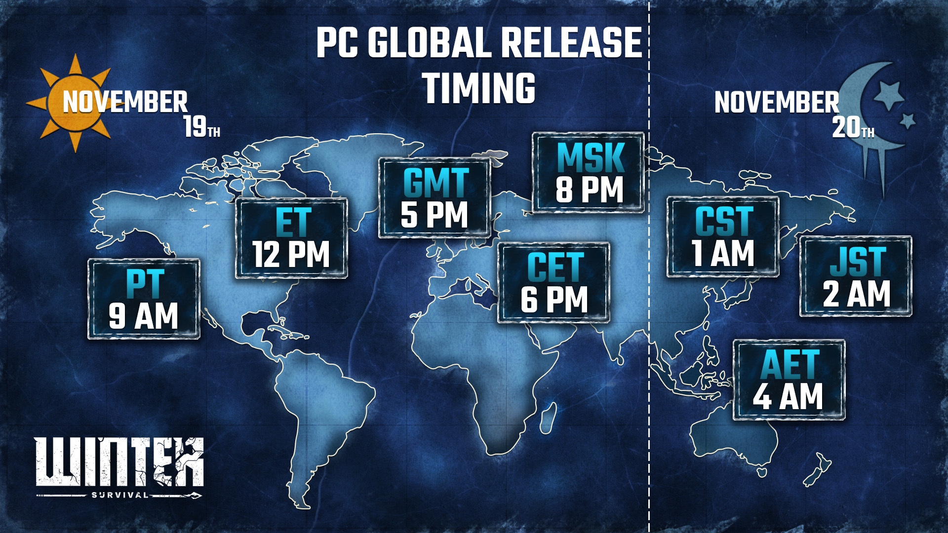 Today is the day — after all this waiting, [b]Winter Survival[/b] is officially leaving Early Access and stepping into its full 1.0 release! No matter where you are, [b]version 1.0[/b] will roll out worldwide [b]today,[/b] November 19, 2025. To help you jump in the moment it goes live, we’ve prepared a global release time map, so you’ll know exactly when Winter Survival unlocks in your region.
